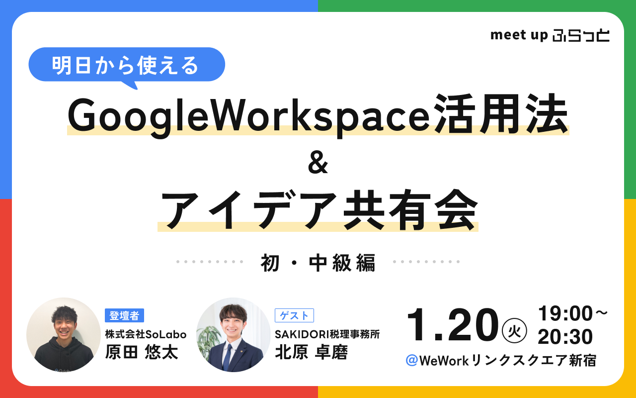 今回は2026年1月20日(火)にWeWorkリンクスクエア新宿にて、明日から使えるGoogle Workspace活用法&アイデア共有会 【初・中級編】を開催いたしました!