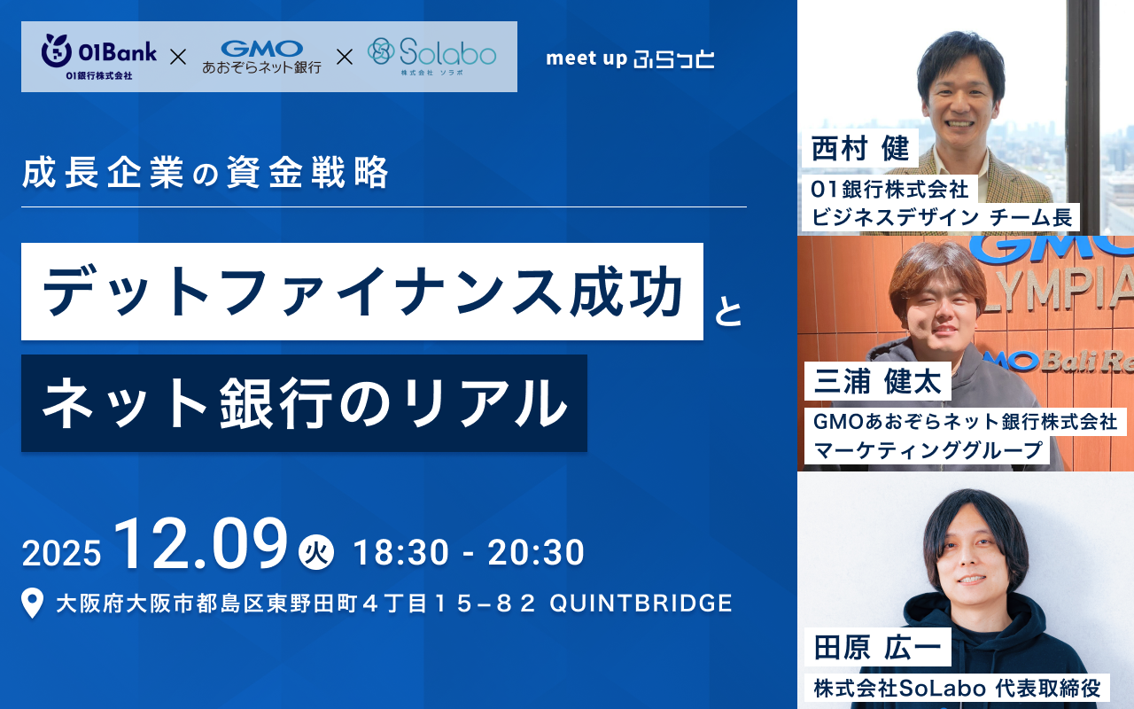 こちらのイベントは3月に行い大好評だったオンラインセミナーの第2弾となるイベントです!株式会社クラス代表の久保裕丈さん、GMOあおぞらネット銀行株式会社ローン事業部企画部長の久保野さん、弊社代表の田原が3人が登壇し、オフラインならではのぶっちゃけ話をお話ししていただきました。